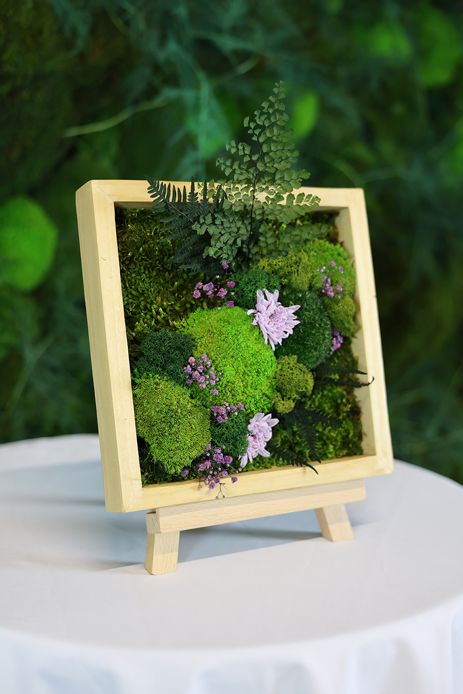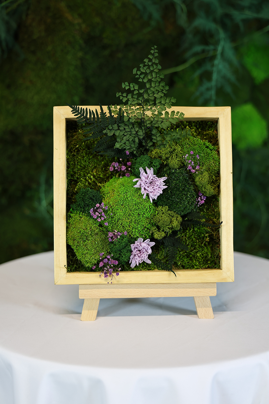 Composé chrysanthèmes, gypsophile, capillaire, mousse et boules de mousse lichen coloré, il offre une esthétique naturelle unique et durable, avec peu d’entretien quotidien.