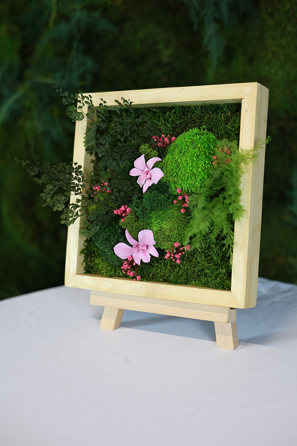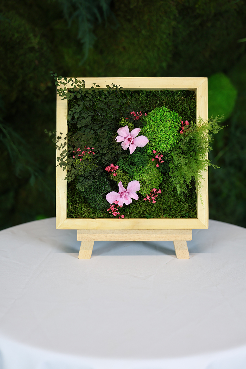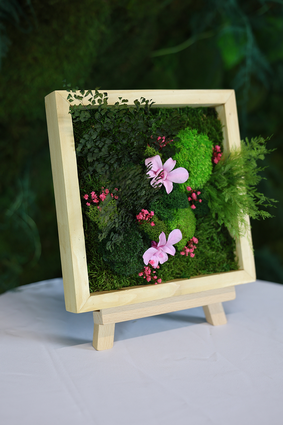 Composé orchidée, gypsophile, fougère, mousse et boules de mousse lichen coloré , il offre une esthétique naturelle unique et durable, avec peu d’entretien quotidien.