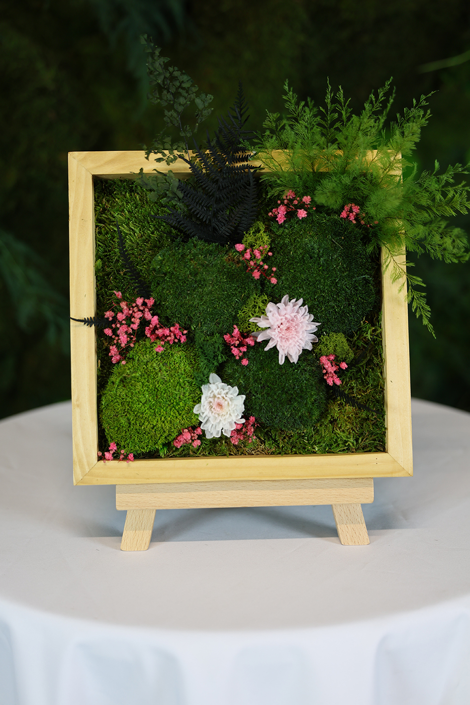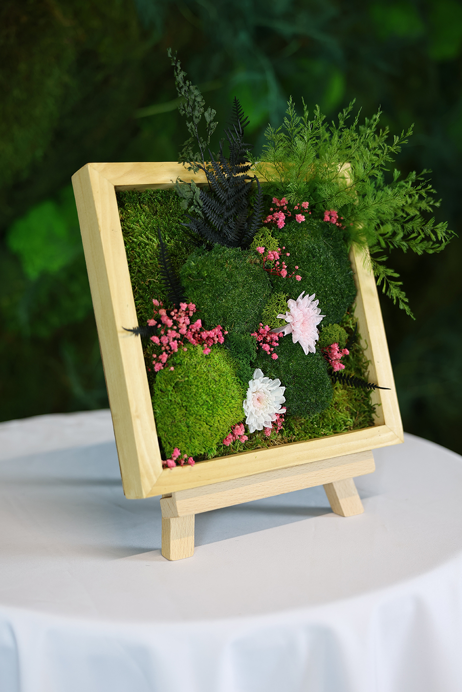 Composé chrysanthème, gypsophile, fougère, mousse et boules de mousse lichen coloré, il offre une esthétique naturelle unique et durable, avec peu d’entretien quotidien.