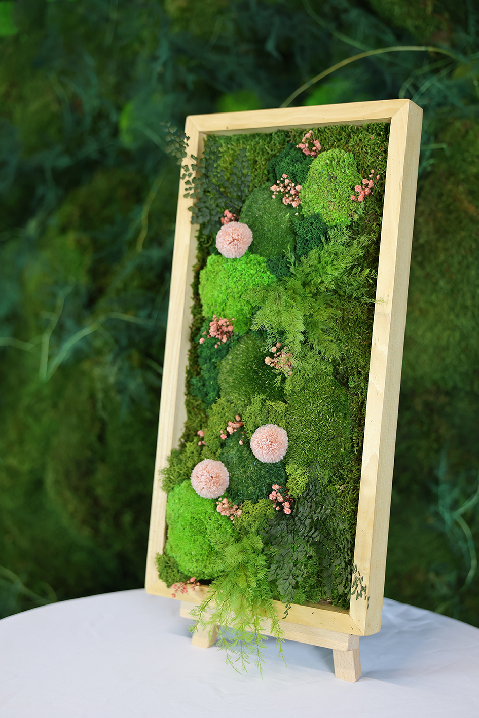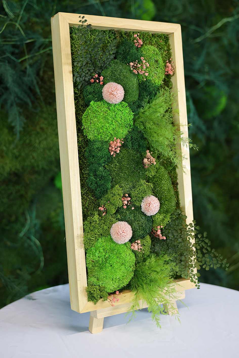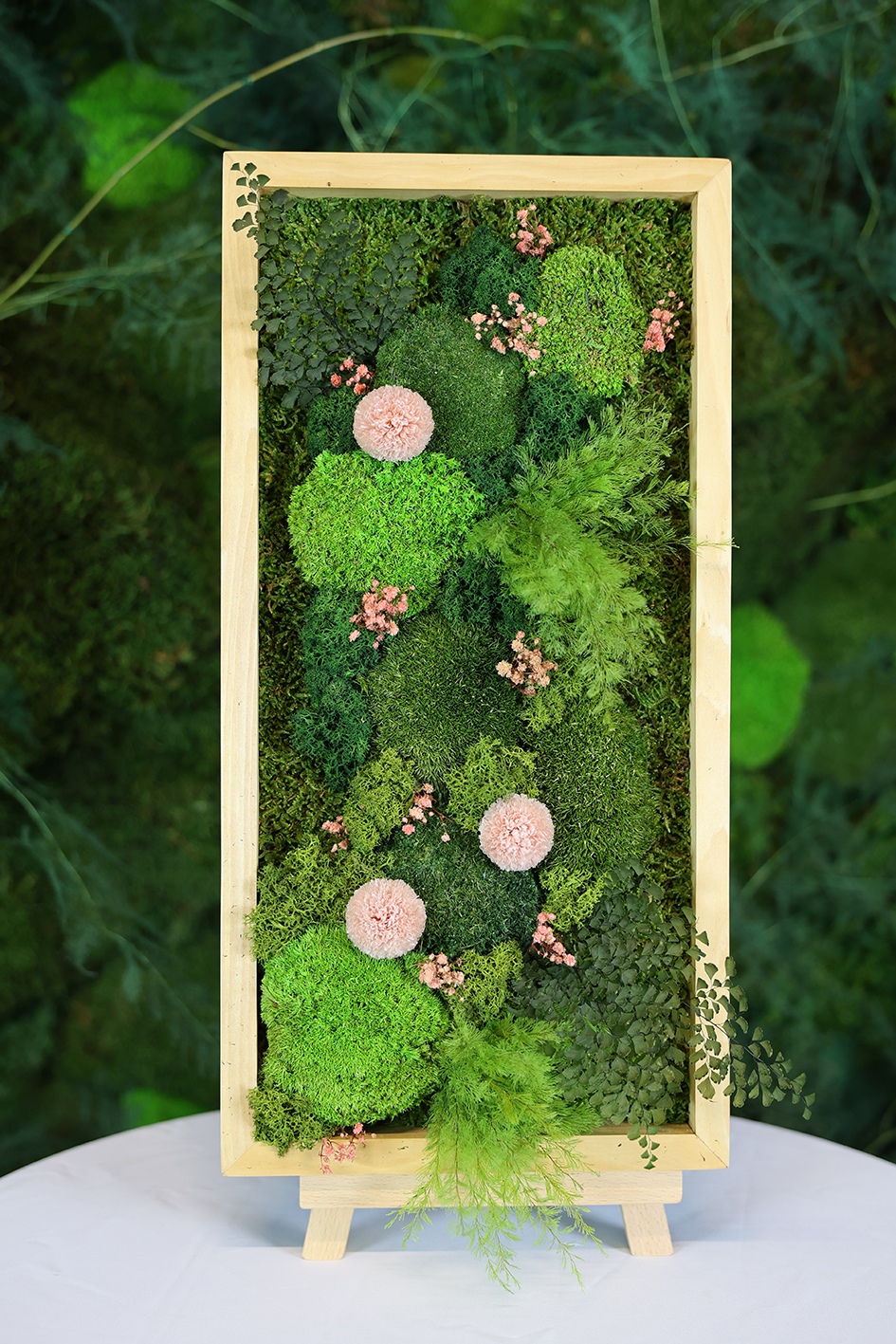 Composé de chrysanthème, gypsophile, fougère, mousse et boules de mousse lichen coloré, il offre une esthétique naturelle unique et durable, avec peu d’entretien quotidien.